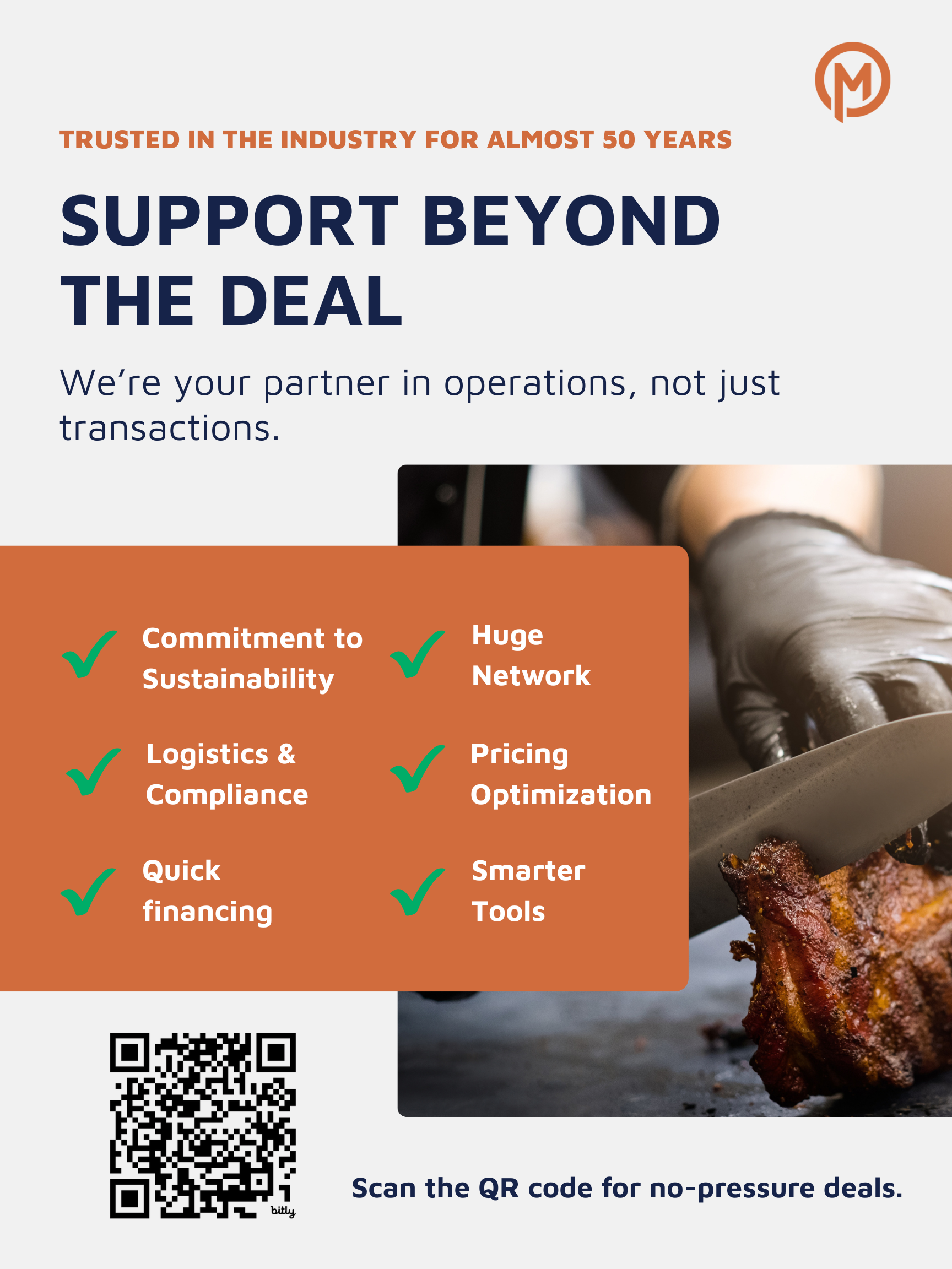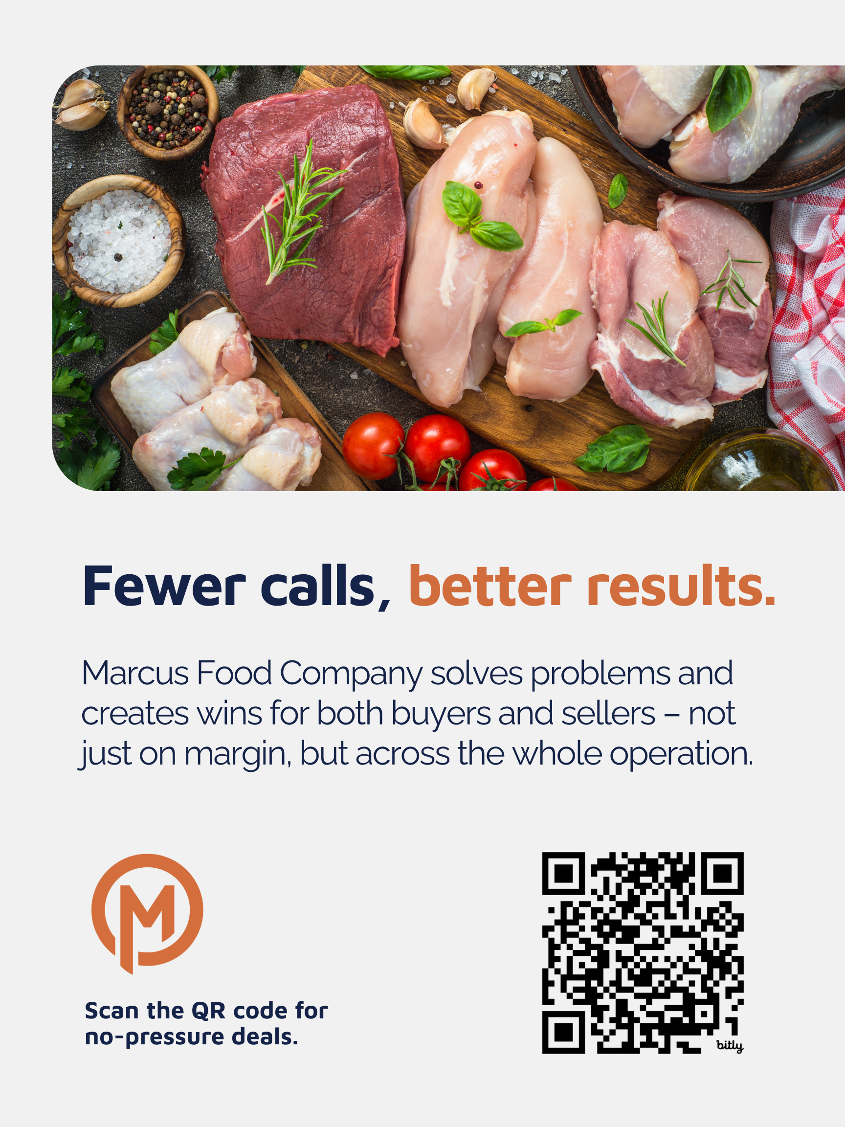 Marcus Food Company is more than a protein trading company. Our modern, cloud-based trading platform connects the largest network of domestic and international protein buyers and sellers. Our pricing optimization, logistics, financing, and compliance services make it easy to buy and sell better.